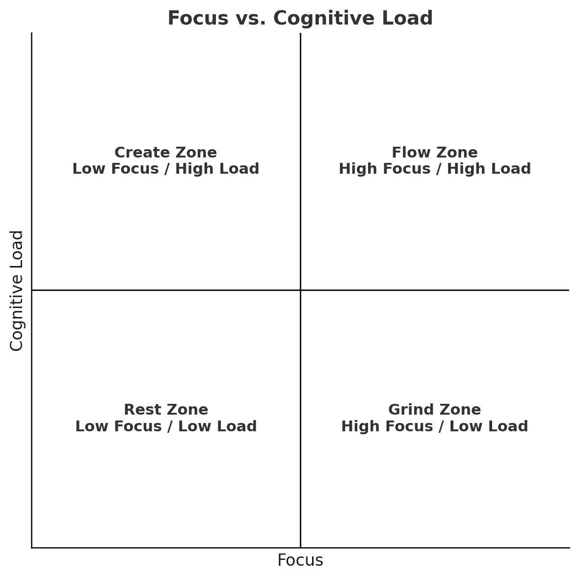 Mapping your mental workload: focus on one axis, cognitive load on the other. Where you spend your time determines not just output—but energy and clarity.